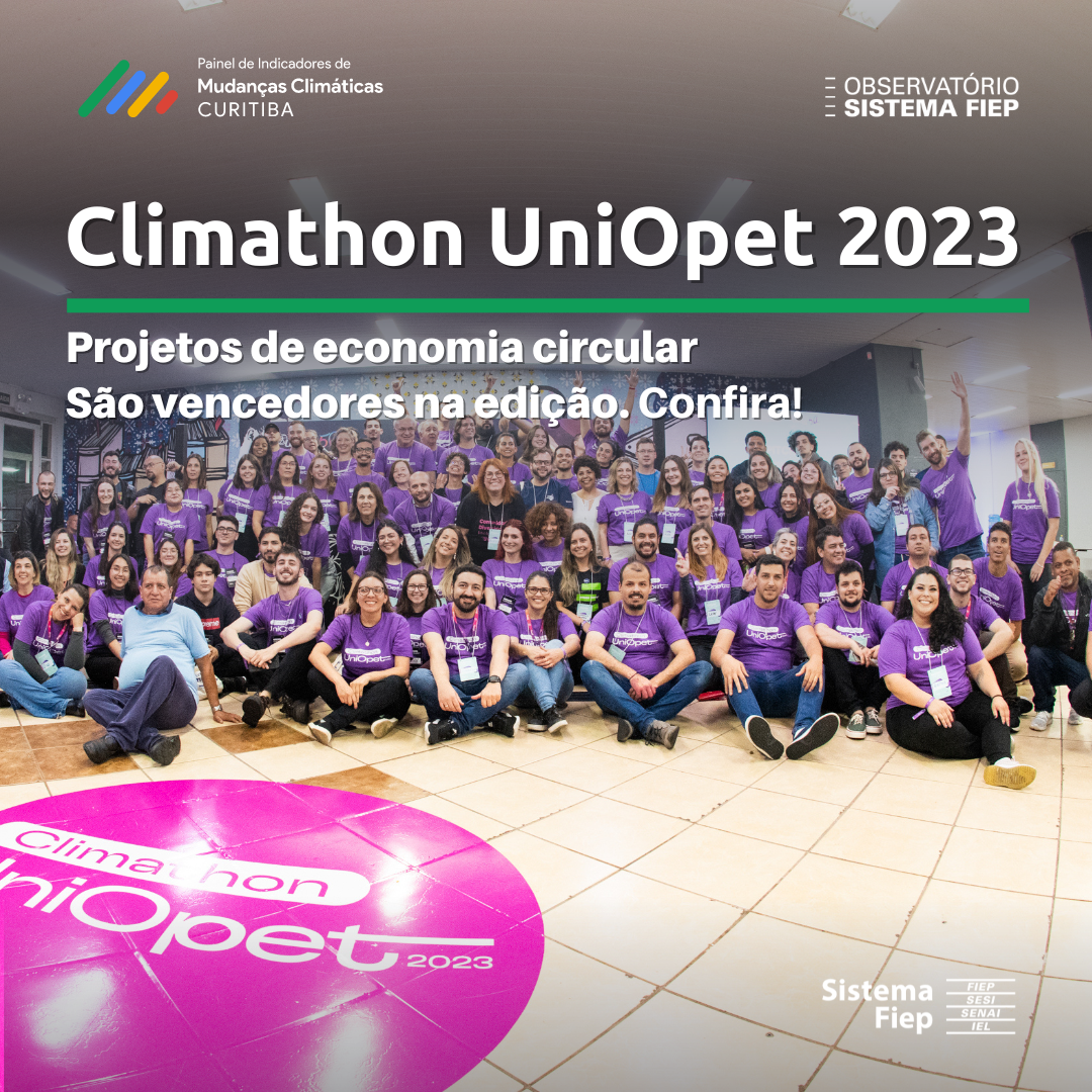 Climathon UniOpet 2023: é tempo de ser mudança! Evento foi realizado em Curitiba no mês de outubro, hackathon de 12 horas reuniu 150 participantes e premiou iniciativas voltadas à economia circular desenvolvidas por universitários e empreendedores. O Climathon é desenvolvido desde 2015 envolvendo cerca de 600 organizadores, 1.000 eventos e mais de 30.000 participantes em todo o mundo, é planejado e coordenado por organizadores e organizações independentes, onde os participantes colaboram para enfrentar os desafios climáticos locais. O hackathon estimulou os participantes a desenvolverem soluções de combate às mudanças climáticas em projetos de economia circular que atendam às necessidades locais, contando com apoio das empresas Condor, Bosch e iCities, além do Vale do Pinhão. Ao reunir em um espaço de networking empreendedores e líderes locais, o Climathon reforça a formação cidadã dos profissionais envolvidos. O grupo Ciclo Verde ficou em 1º lugar; o 2º lugar, ficou com os participantes do grupo Ecoloop e os participantes do grupo Challenge, 3º lugar.