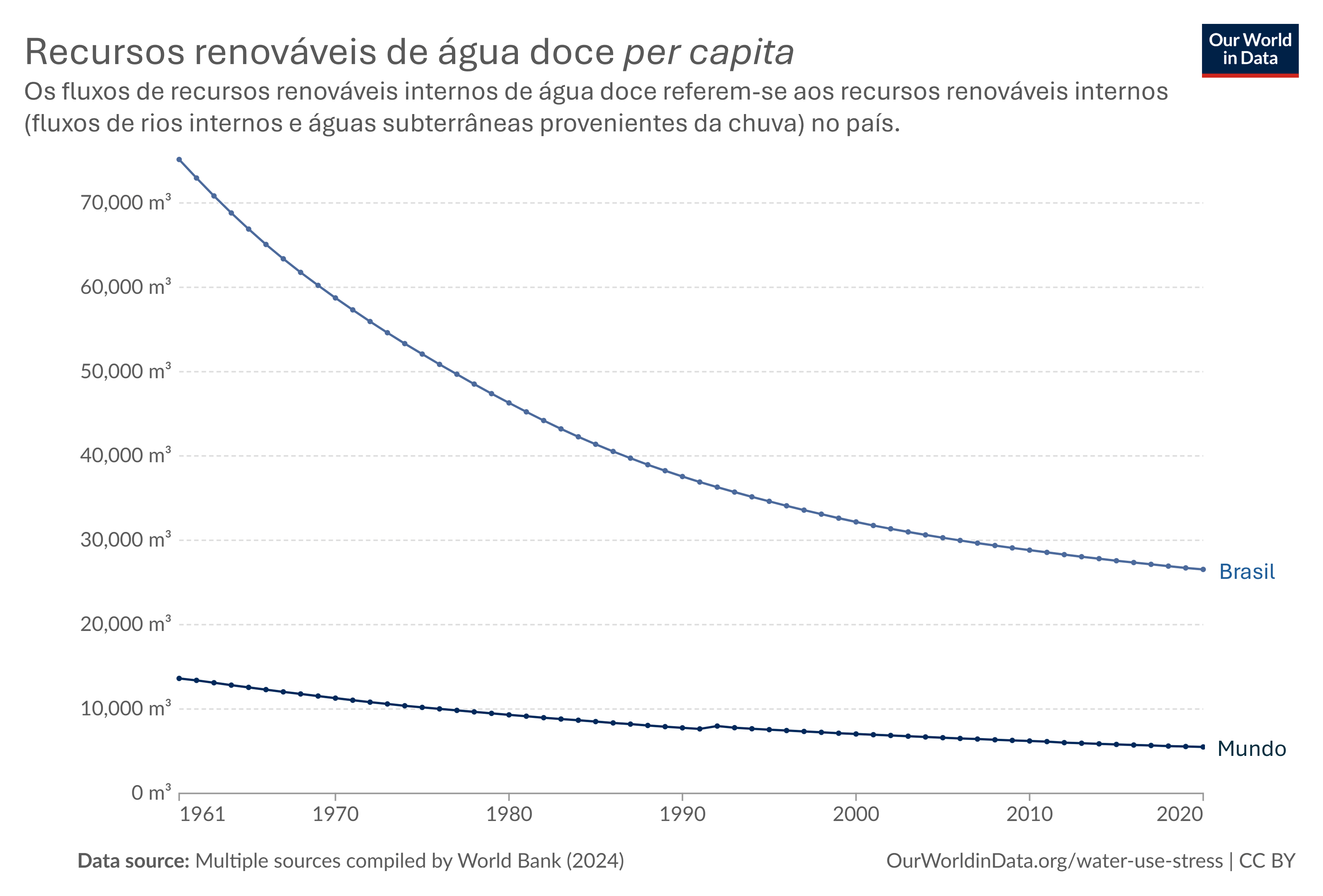 Mesmo com abundância de recursos hídricos, a disponibilidade da água doce per capita tem diminuído no país ao longo dos anos em função, principalmente, do crescimento populacional. IMAGEM: traduzido e modificado de Our World in Data