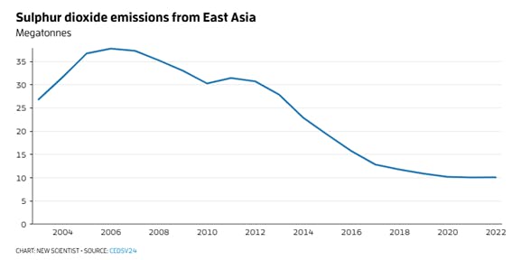 O dióxido de enxofre (SO2) é o gás precursor dos aerossóis de sulfato, que atuam na atmosfera como “resfriadores”. Desde 2010, as emissões no Sudeste Asiático, em particular na China, vêm diminuindo em função das políticas para melhorar a qualidade do ar. IMAGEM: NewScientist