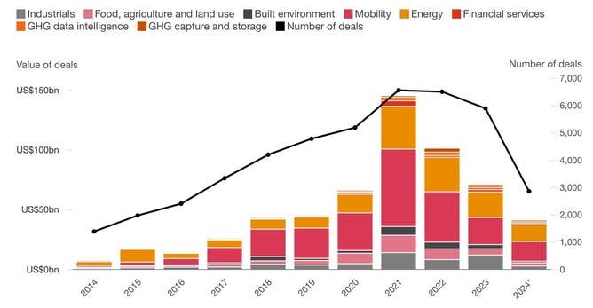 Até o terceiro trimestre de 2024, os setores que mais receberam investimentos foram o de mobilidade e de energia, enquanto o financiamento de tecnologias climáticas para a indústria encolheu em comparação ao período anterior. IMAGEM: PwC